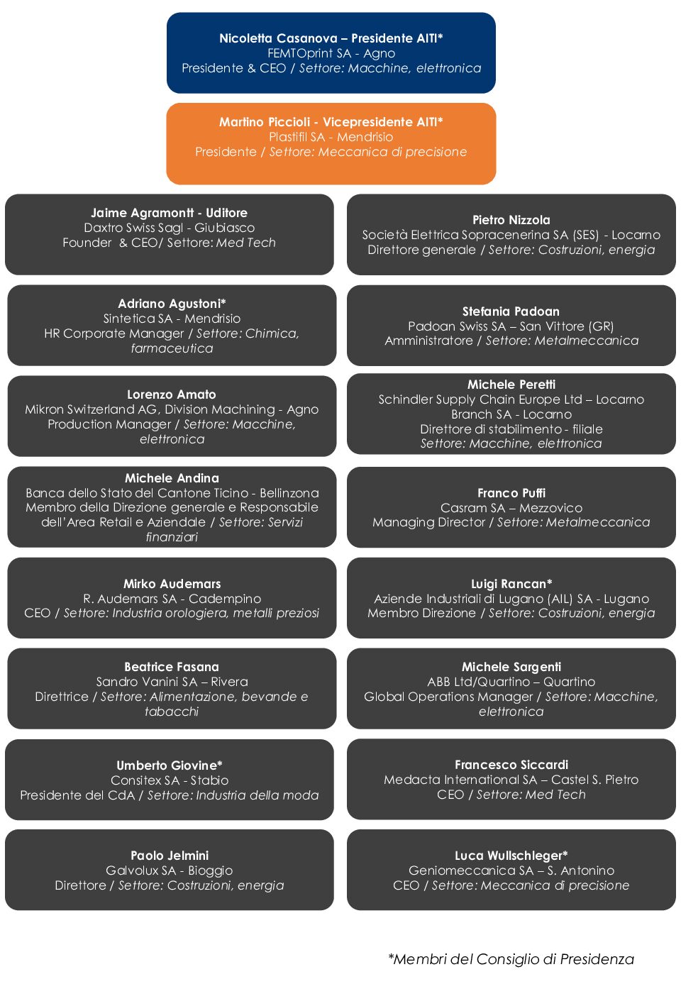Unitamente a Martino Piccioli e alla Presidente AITI Nicoletta Casanova, CEO, Presidente e co-fondatrice di FEMTOprint SA e Presidente e co-fondatrice di AxCellerate, compongono il nuovo Consiglio di Presidenza di AITI per il quadriennio 2025-2029: Adriano Agustoni, HR Corporate Manager di Sintetica SA; Umberto Giovine, Presidente del CdA della Consitex SA; Luigi Rancan, Membro di Direzione di Aziende Industriali di Lugano (AIL) SA; Luca Wullschleger, CEO di Geniomeccanica SA.
